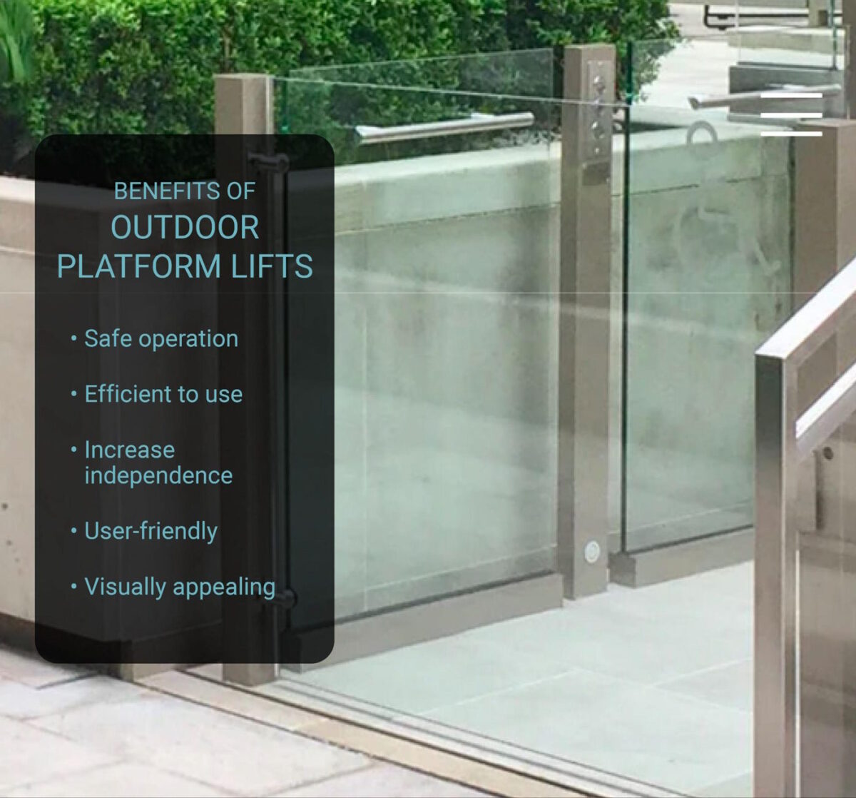 These lifts are designed with convenience in mind. Whilst visual appeal is strongly considered, functionality is prioritised first and foremost for the benefit of wheelchair users.